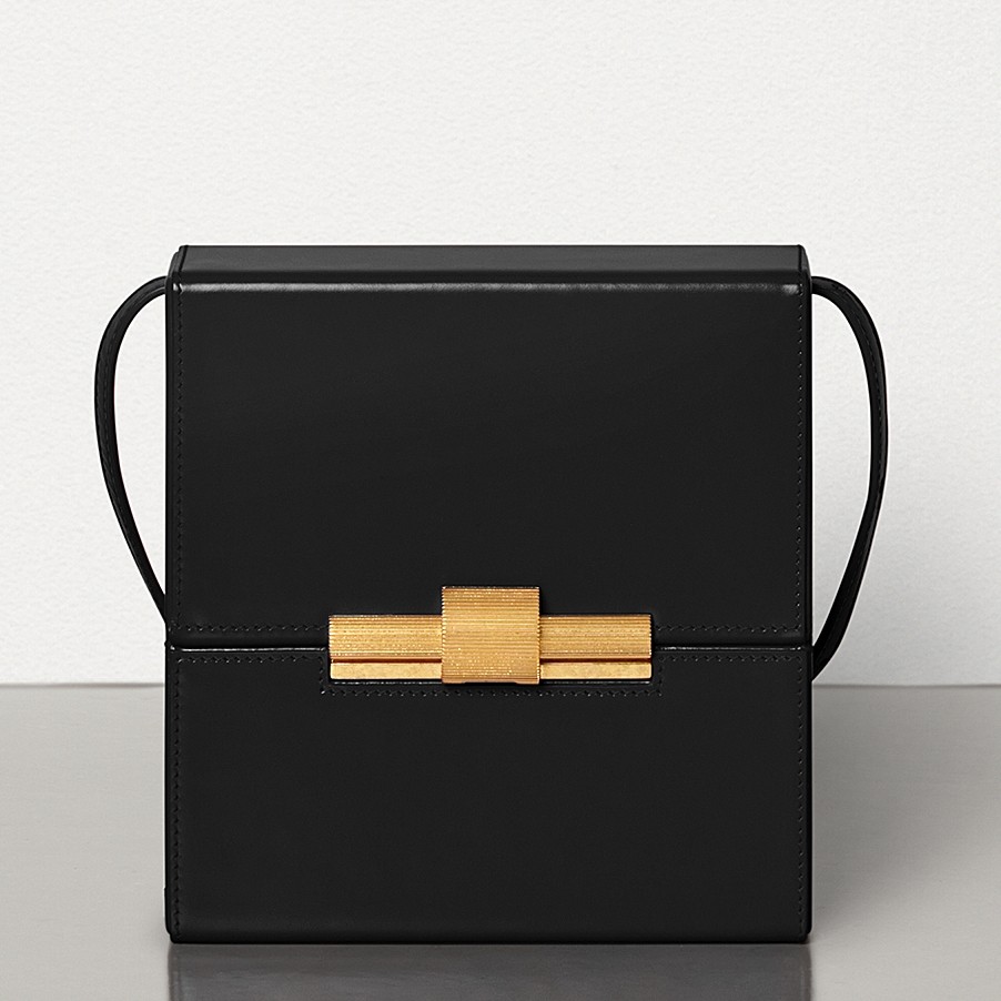 - 100% calfskin leather- Squared shape with a hinged top- Cylindrical, ridged gold closure- Smooth bonded nappa interior with a single compartment- Detachable strap to wear crossbodySize: 18 x 19 x 5 cmComes with Bottega Veneta dust bag and authenticity card.