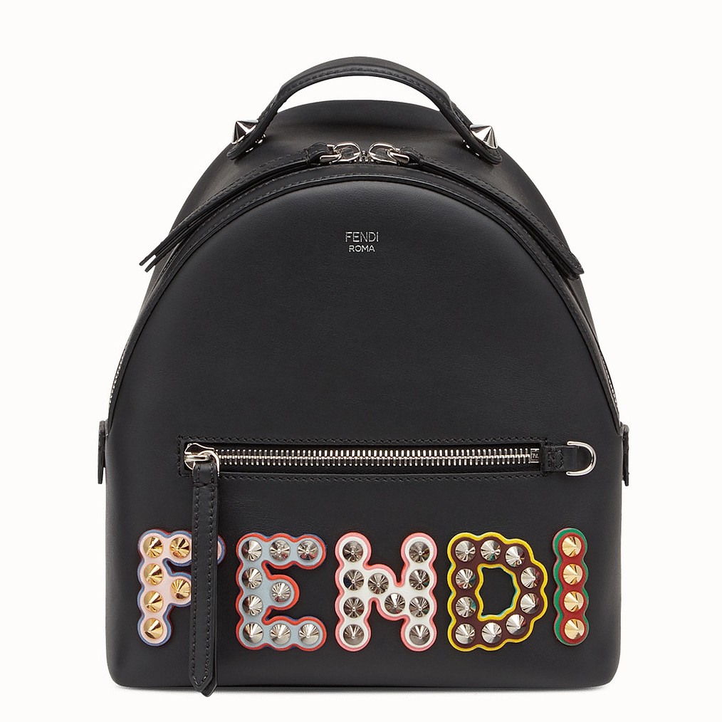 - 100% calfskin leather- Adjustable shoulder straps- Front pocket- Front FENDI logo decorated with multicolor studs- Top double zip closure- Interior one zip pocketSize: 21 x 23 x 9 cmComes with Fendi dust bag and certificate card.