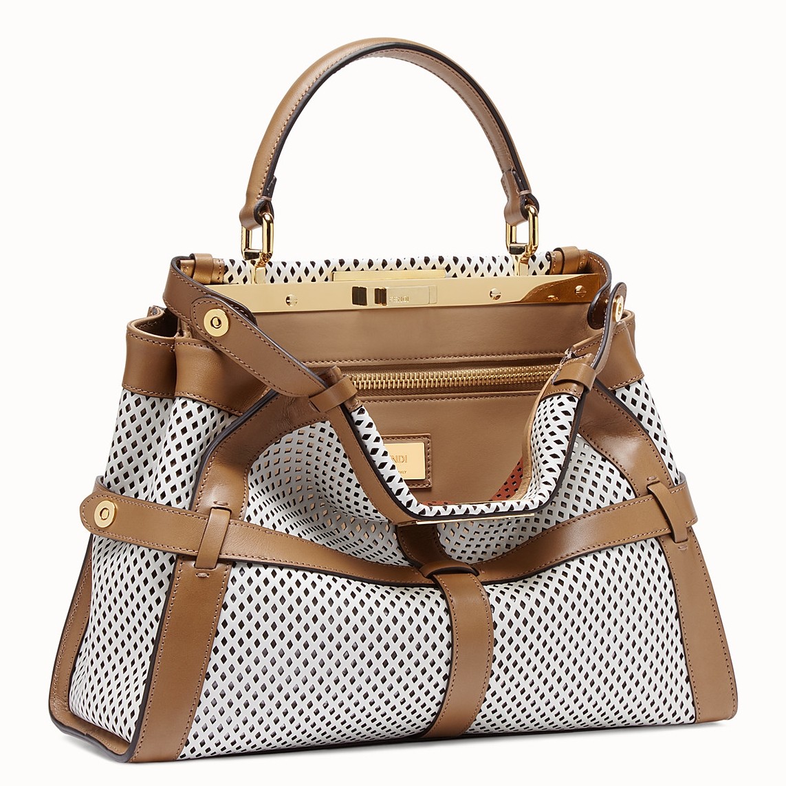 - 100% perforated calf leather- Single handle- Adjustable, detachable shoulder strap- Twist lock on both sides- Leather lining with zip pocket- Two compartments divided by a stiff partition- Gold-finish metalwareSize: 33 x 26 x 12 cmComes with Fendi dust bag and certificate card.