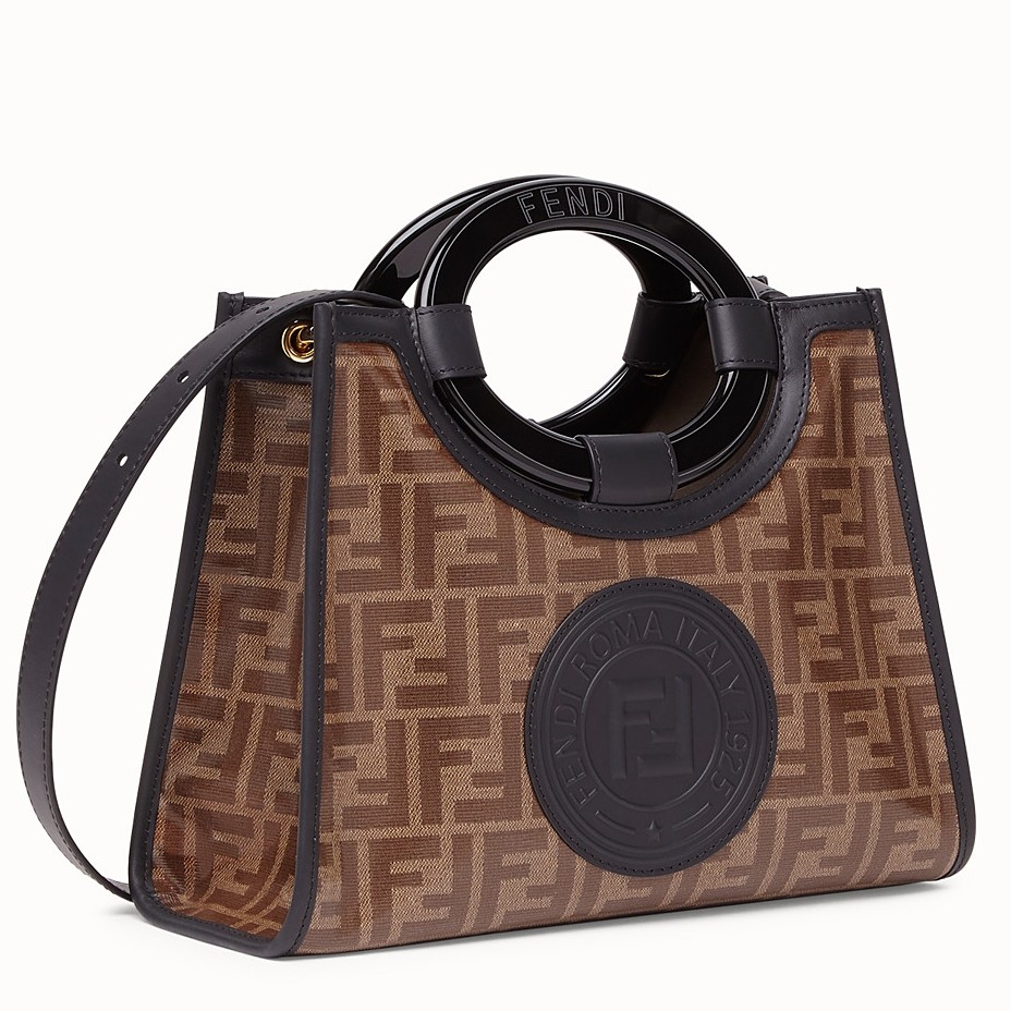- Glazed fabric with jacquard FF- Decorated with leather Fendi Stamp patch on the front- Removable shoulder strap- Round cutout top handles- Gold-finish metalware- One exterior zip pocketSize: 28 x 21 x 11.5 cmComes with Fendi dust bag and certificate card.